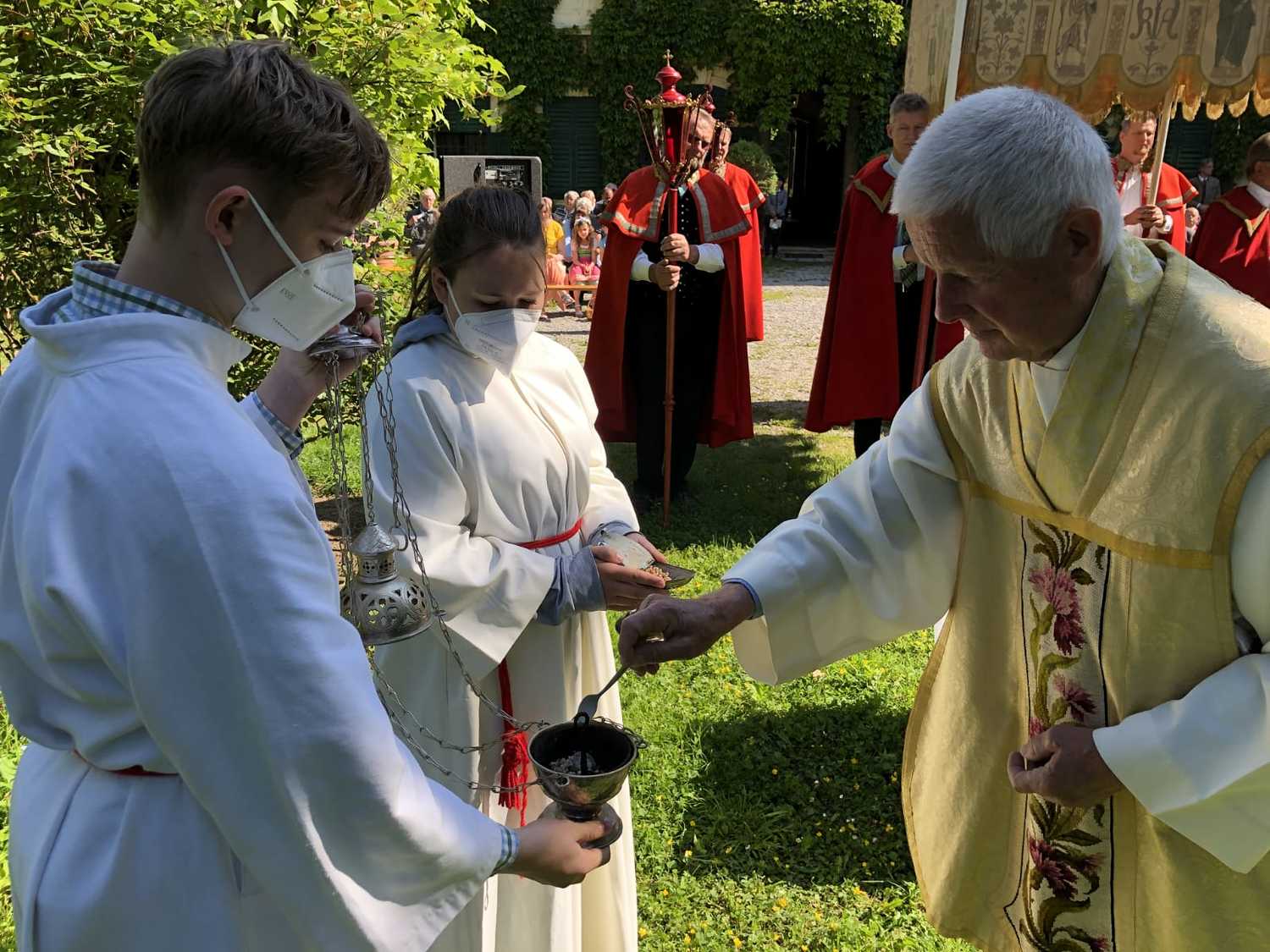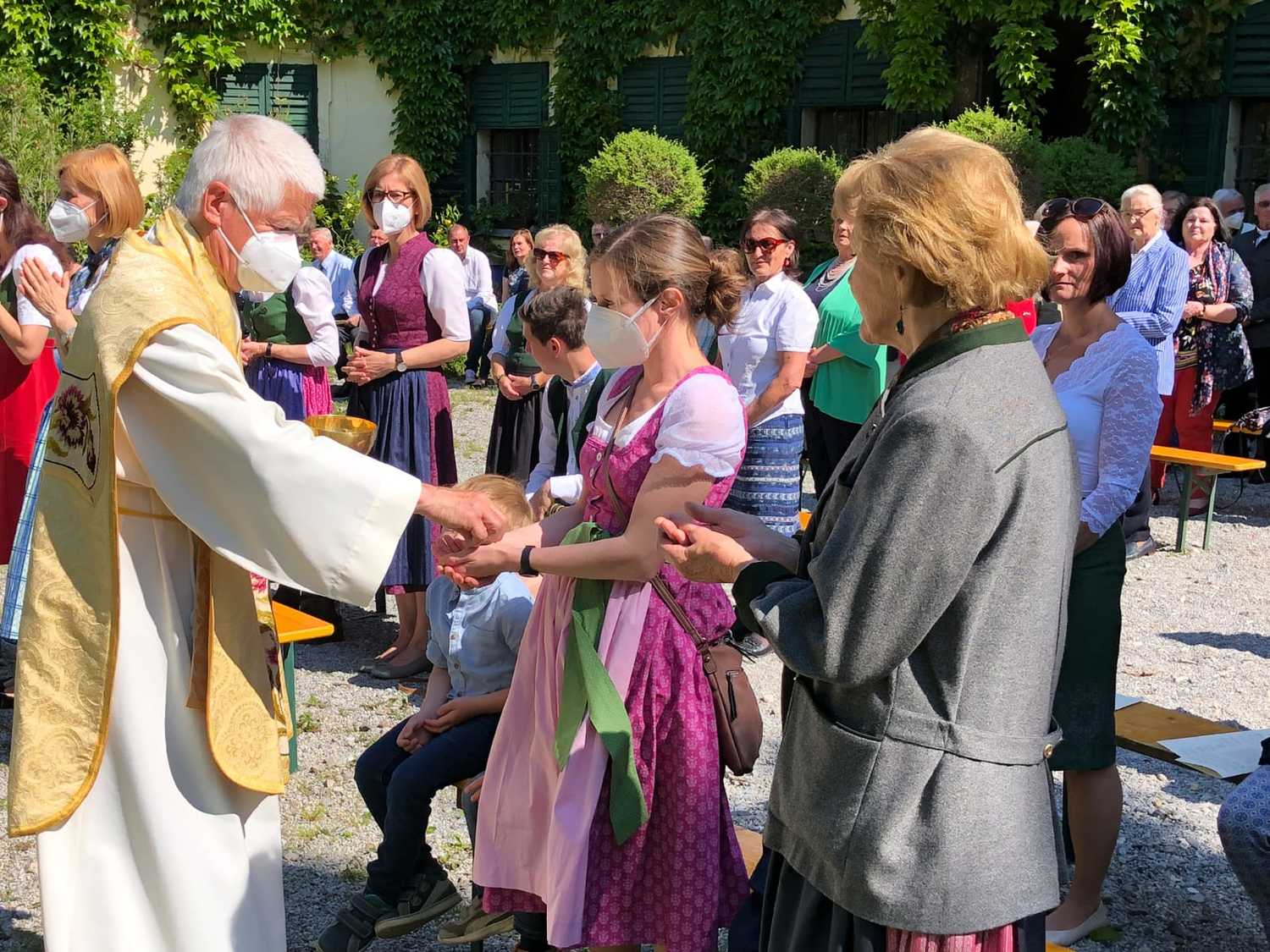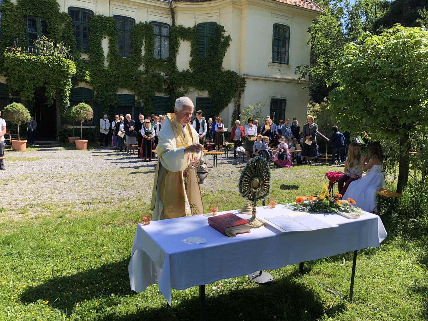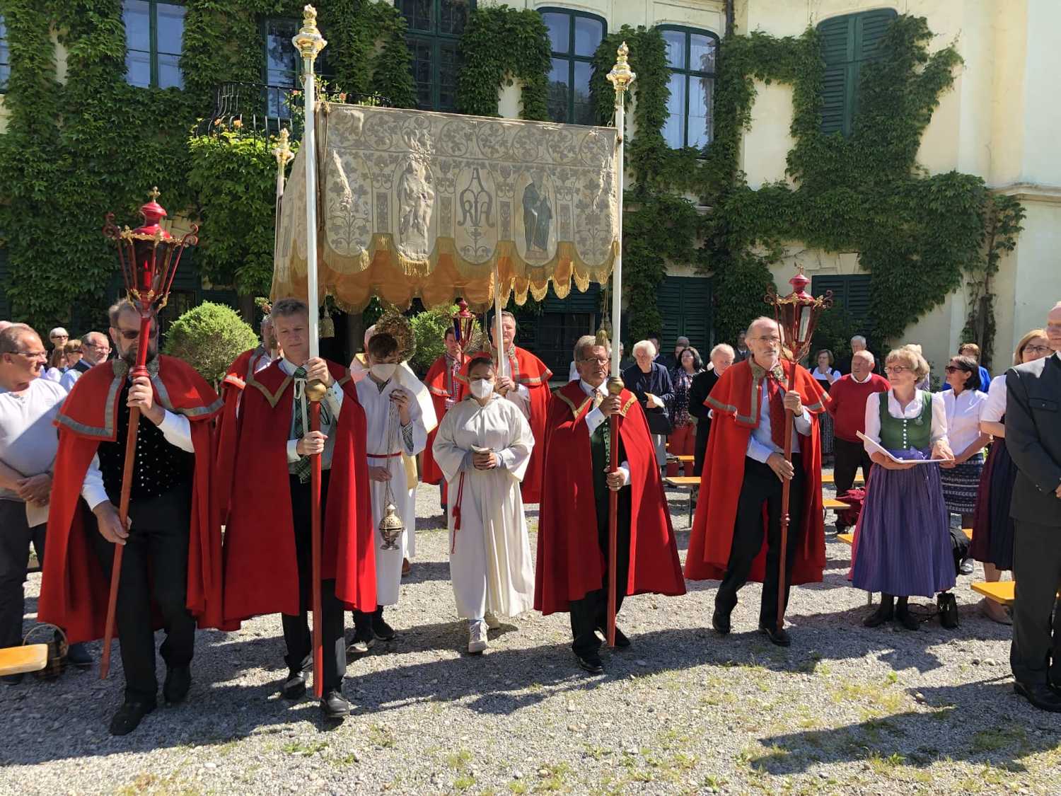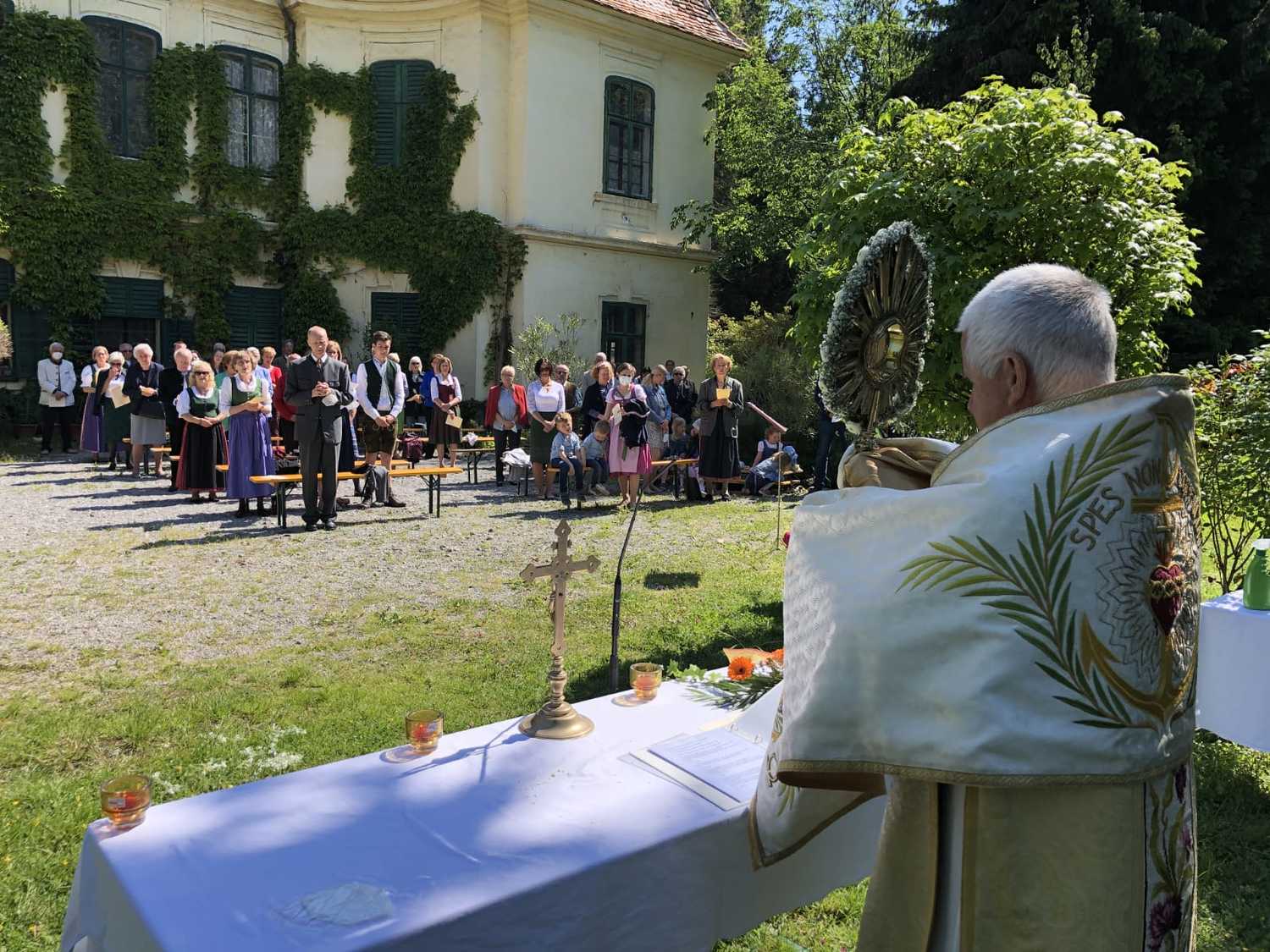 Die Natur zeigte sich von ihrer schönsten Seite, als wir im Hof des Schlosses Thinnfeld das Fronleichnamsfest feierten. Dabei wurden der restaurierte "Himmel" und die Laternen gesegnet.