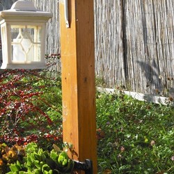 Unter dem Kruzifix sind eine weiße Laterne und ein Blumenkisterl angebracht. Ein Betonfundament sorgt für einen sicheren Standort. Sohn Patrik Neuherz, ein gelernter Spengler, stattete dieses Wegkreuz kunstvoll mit einem Kupferdach aus. Zwischen den gepflanzten Sträuchern ist auch ein Zugang möglich.